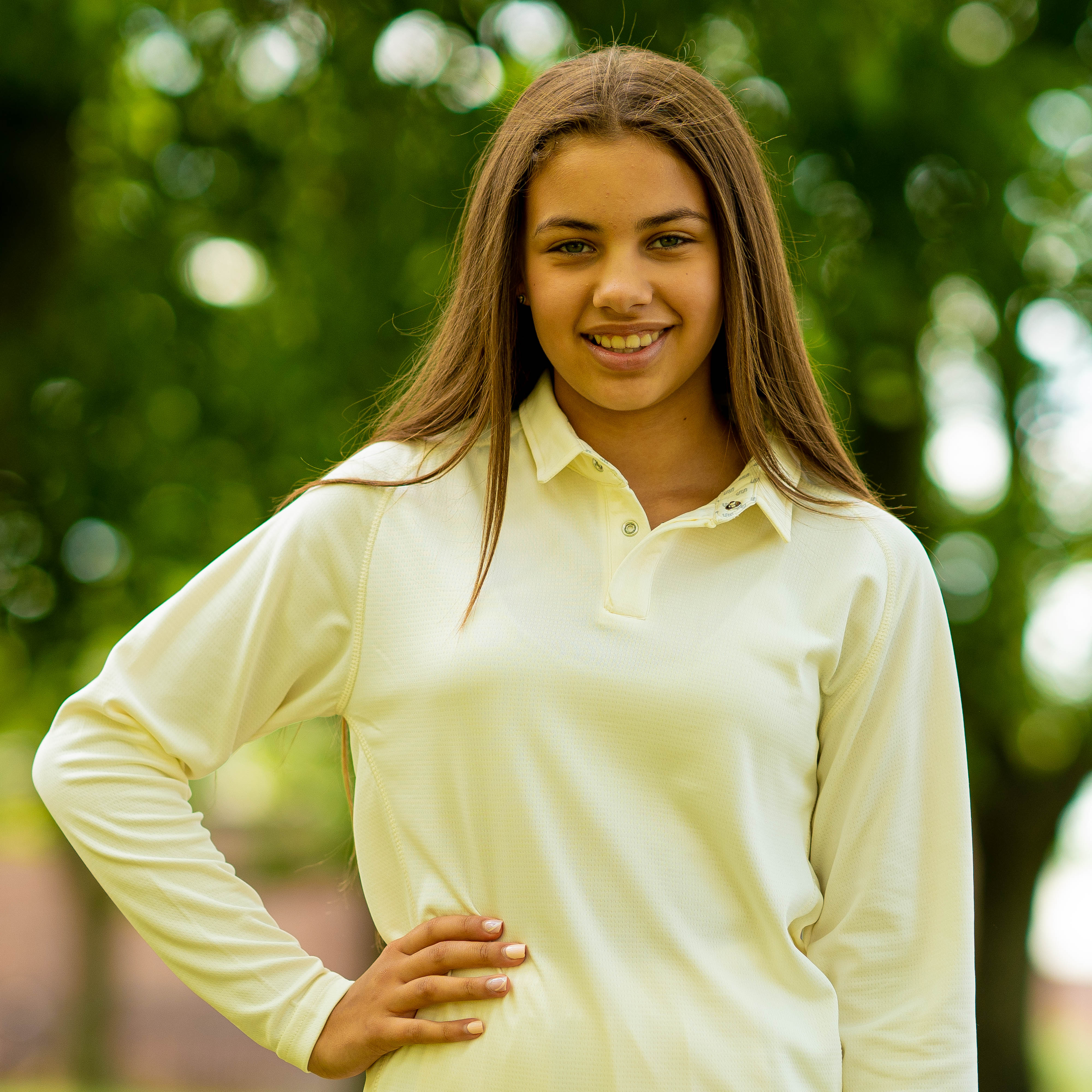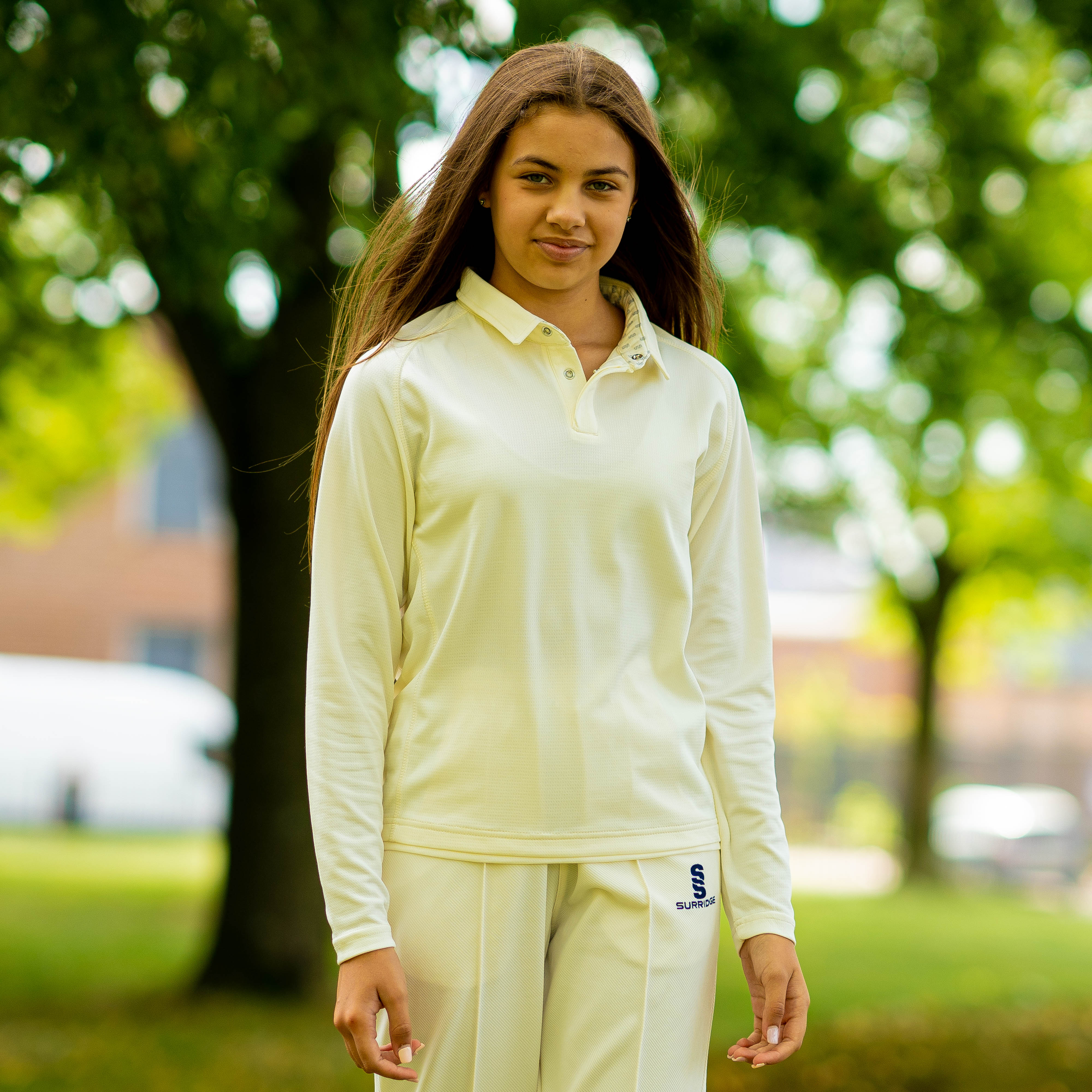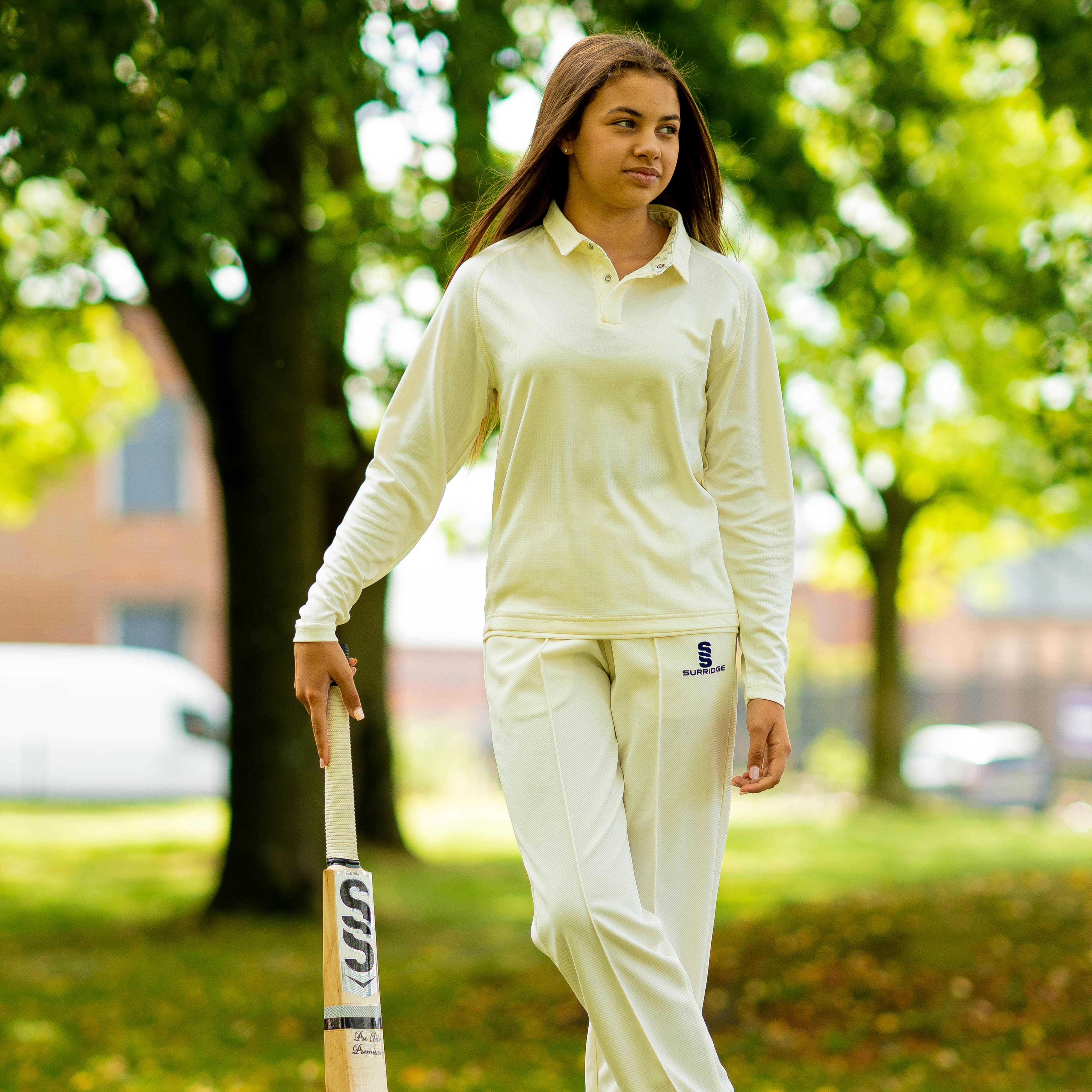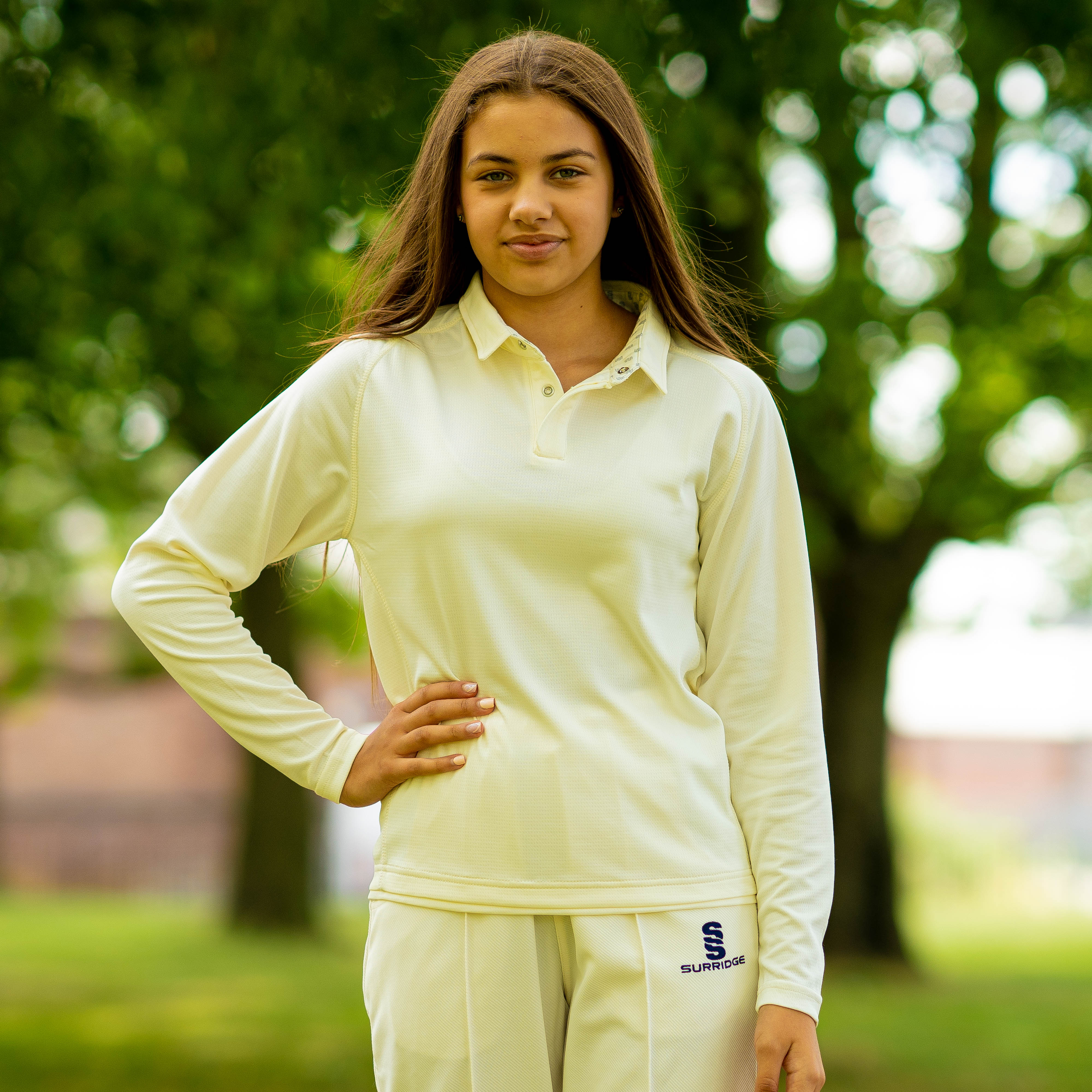 Modern fitted collared cricket shirt with pop studs ad self fabric collar.